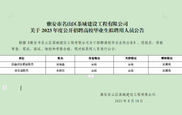 雅安市名山區(qū)茶城建設(shè)工程有限公司系雅安市名山區(qū)區(qū)屬一級(jí)國(guó)有企業(yè),成立于2018年,注冊(cè)資本2億元,主要經(jīng)營(yíng)范圍為對(duì)土地、城市資源等領(lǐng)域及保障性住房、房地產(chǎn)開(kāi)發(fā)、城市基礎(chǔ)設(shè)施、公共服務(wù)設(shè)施等進(jìn)行經(jīng)營(yíng)管理;并開(kāi)展項(xiàng)目投資、工程管理服務(wù)及園林綠化、環(huán)境治理、土地整理等各類(lèi)工程建設(shè)活動(dòng)。根據(jù)公司2022年人員招聘計(jì)劃,茶城公司及全資子公司擬面向社會(huì)公開(kāi)招聘高校畢業(yè)生3名(含2020年、2021年未就業(yè)高校畢業(yè)生和2022年應(yīng)屆高校畢業(yè)生。特別說(shuō)明:“未就業(yè)高校畢業(yè)生”需同時(shí)滿(mǎn)足以下條件:拿到畢業(yè)證和學(xué)位證;在規(guī)定擇業(yè)期內(nèi)沒(méi)有與任何單位簽訂任何形式的勞動(dòng)合同...