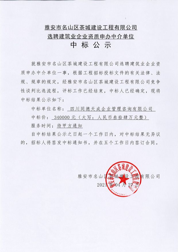 選聘建筑企業(yè)資質(zhì)申辦中介單位中標公示